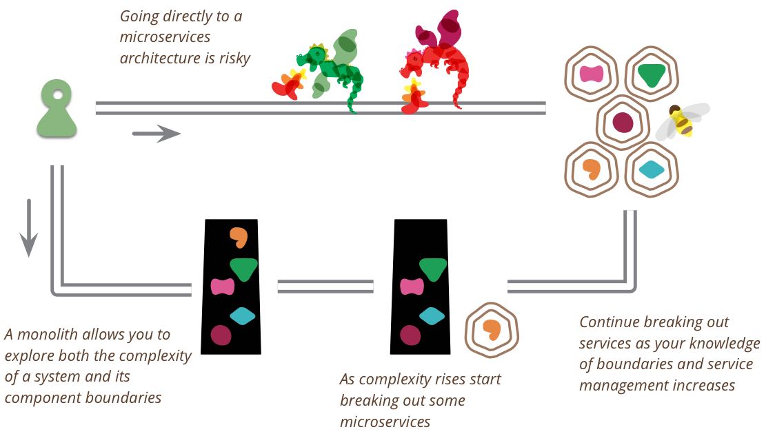 微服务通常由单体系统演化而来,将系统解耦到某种随时可以转变为微服务的状态,并维持一段事件,与业务需求无关的决策,包括何种框架,数据库等,都可以被适当推迟。