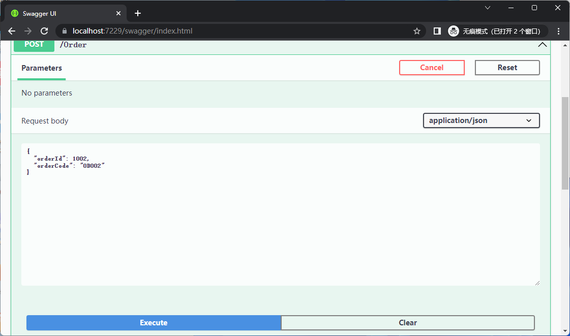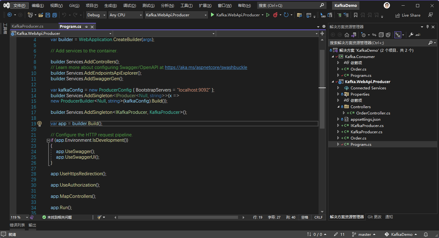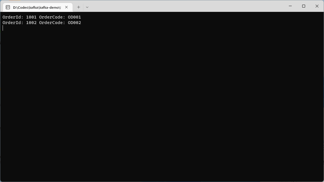 运行起来2个项目,并向/Order接口Post测试数据,可以看到Consumer应用实时接收到相关消息。