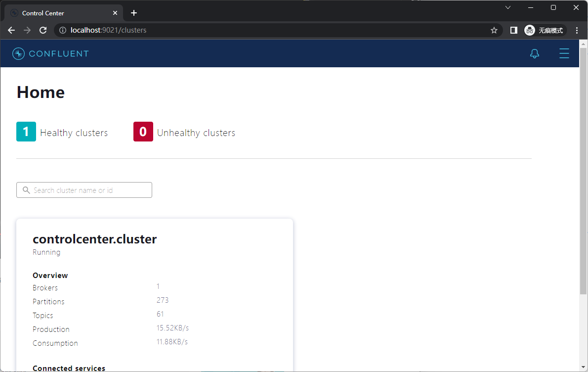 Confluent Control Center是一个基于Web,管理和监控Apache Kafka的工具,根据docker-compose.yml相关配置,打开http://localhost:9021/clusters。