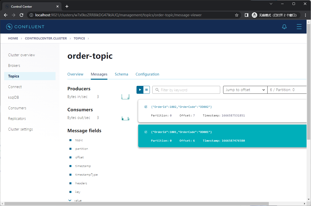 打开Confluent Control Center,可以看到相关Topic和消息。